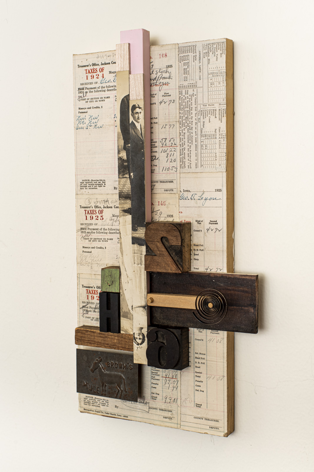 assemblage photographs, wood, metal tobacco tin, watch parts and printers block letter and numbers.