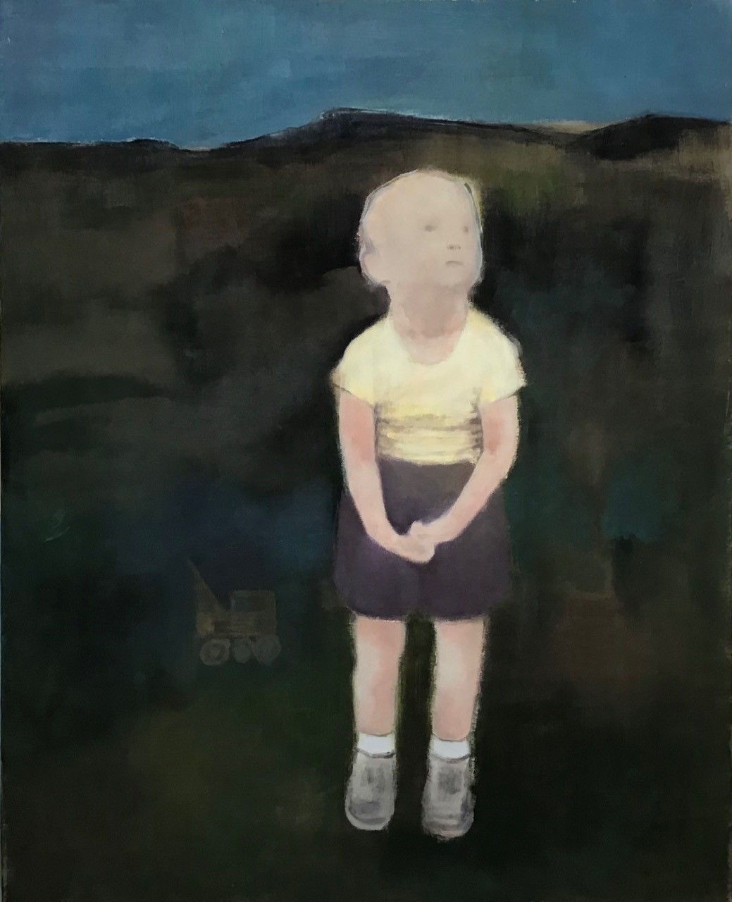 When painting Pamela Mooney is always looking for ways to simplify. She starts with photographs found online or photographs from family albums. She likes to use saturated colors for dark values, different hues of the same color, and colors that don’t belong. In all of this it is usually the unplanned marks that generate new approaches which leads her to paint a new version of the painting which also influences the work and pushes it in a new direction. During the pandemic she took to painting flowers and using a brighter palette. This painting she had finished awhile ago, but then she took it out and changed the dark background to bright blue.